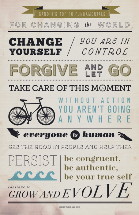 18Thinking of a new year ahead of us I came across this poster put together by a graphic design student based on the words of Gandhi (idea-obscura.tumblr.com/post/2409119224/ive-been-thinking-of-doing-this-for-a-while-now). Great words of wisdom that seem simple in application but as we reflcet on them we also discover that for many of us these are difficult things to do. While we may not get each of these right in our lives all of the time this serves as a reminder of things we can do to make our world a better place one person at a time starting with ourselves.